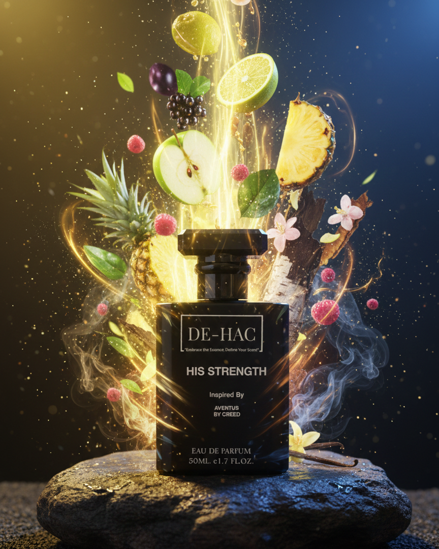 HIS STRENGTH by DE HAC captures the essence of masculine power and sophistication. Inspired by the iconic Aventus by Creed, this fragrance opens with an electrifying burst of fresh bergamot, blackcurrant, crisp apple, and juicy pineapple. This fruity-citrus explosion feels instantly invigorating.