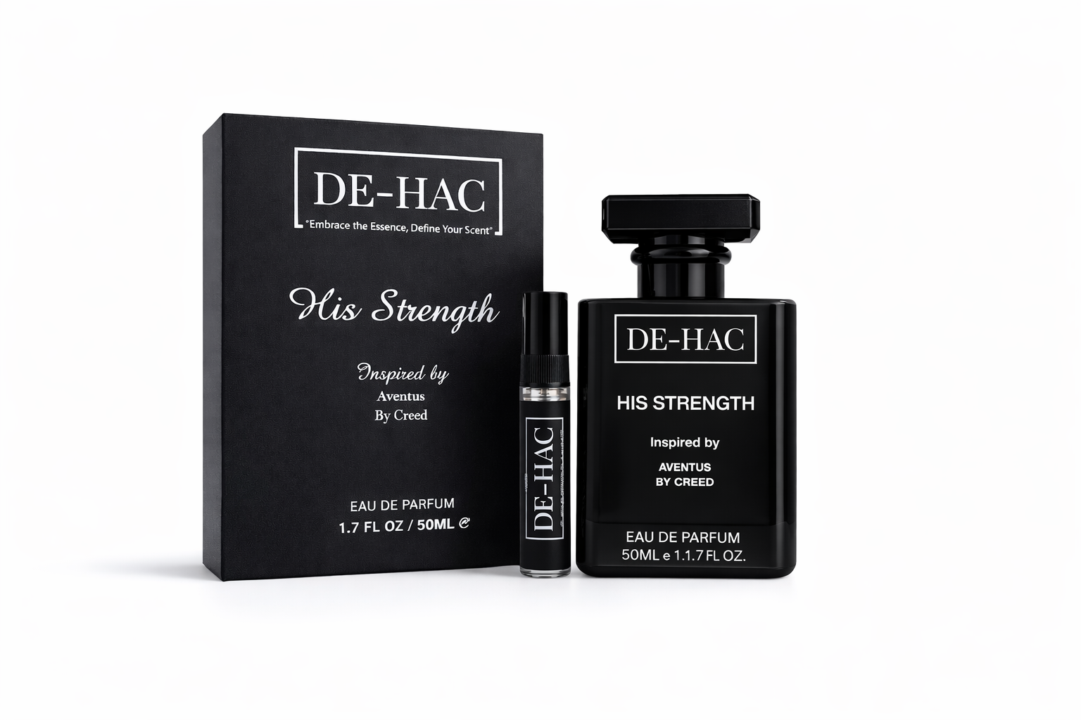 HIS STRENGTH by DE HAC is a bold fruity-citrus Eau de Parfum for Men, inspired by the legendary Aventus by Creed. A cult classic featuring vibrant pineapple, bergamot, and smoky birch for a powerful, confident signature that commands respect.